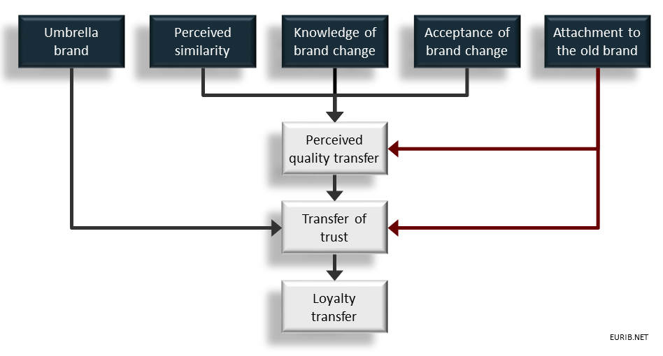 - Gehechtheid (attachment) aan het oude merk: hoe sterker klanten aan het oude merk zijn gehecht, des te lastiger is het om de waargenomen kwaliteit en het vertrouwen naar het nieuwe merk over te hevelen.